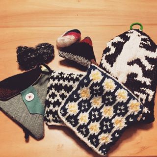 アクリルたわし、ミトン、ブローチ、さをり織り三角ポーチ、石ころペーパーウェイト。